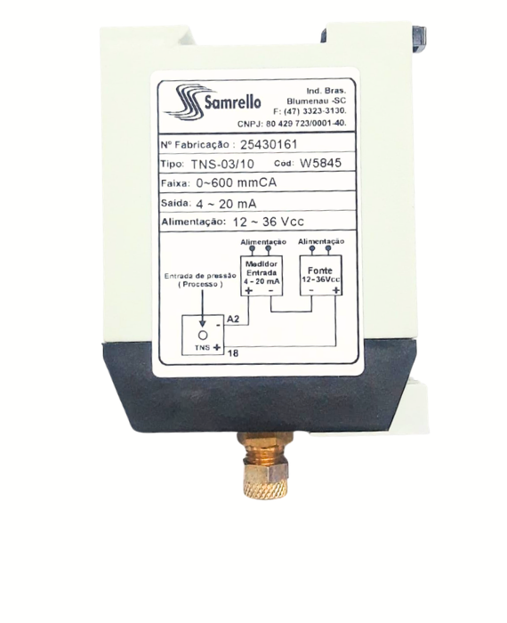 O transmissor de nível/pressão TNS-03/10 (cód. 5845) é um dispositivo eletrônico utilizado para medição contínua de nível de líquidos através de pressão hidrostática, operando com alimentação em 12 a 36Vcc. Indicado para monitoramento de nível em reservatórios e tanques com coluna de até 600 mmCA.