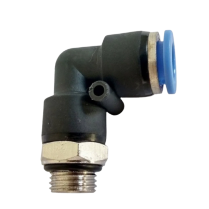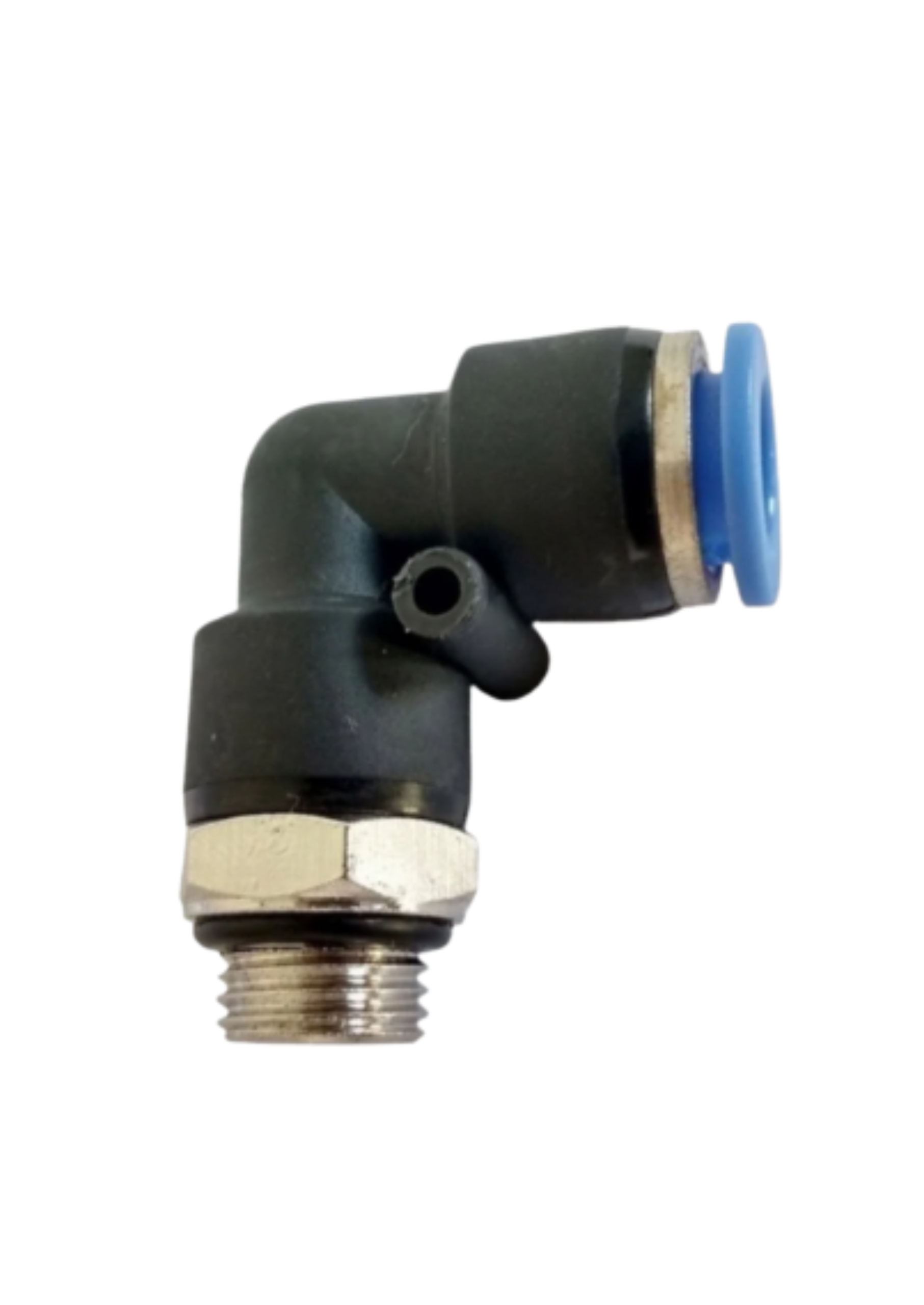 União macho cotovelo para tubo pneumático de 12 mm com rosca macho 1/4" BSPP. Indicada para mudança de direção da linha em 90°, proporcionando instalação compacta e vedação eficiente em sistemas de ar comprimido.