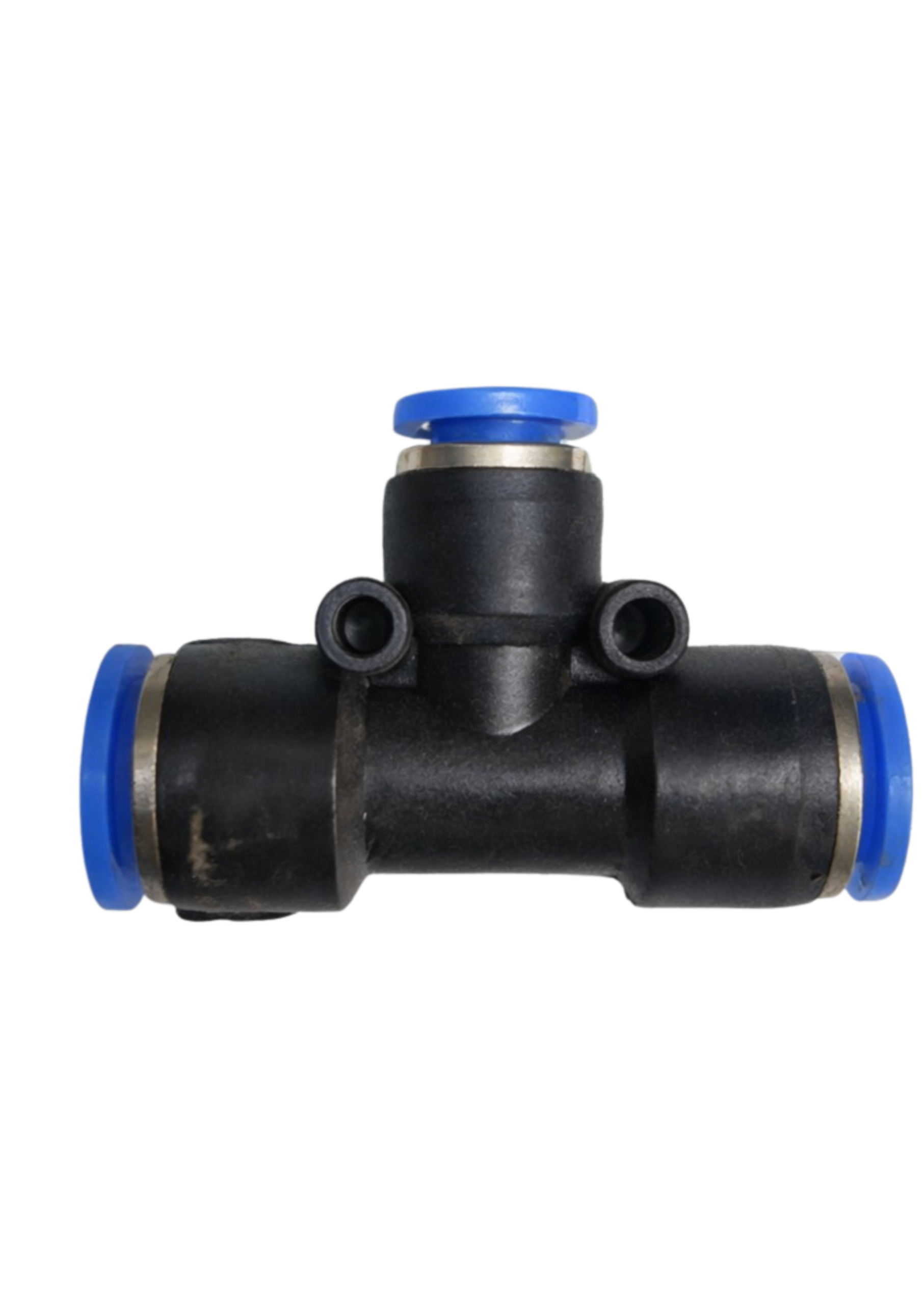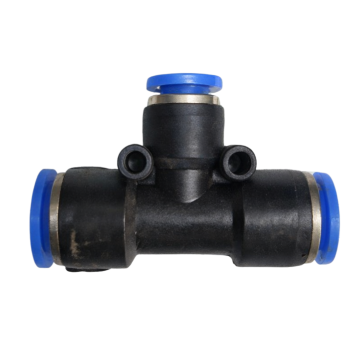 União em Tê com redução para sistemas pneumáticos, modelo PEG101008, projetada para conectar três segmentos de tubo, sendo duas conexões de 10 mm e uma reduzida de 8 mm. Ideal para ramificar e redirecionar o fluxo de ar comprimido com transição de diâmetros de forma eficiente e segura.