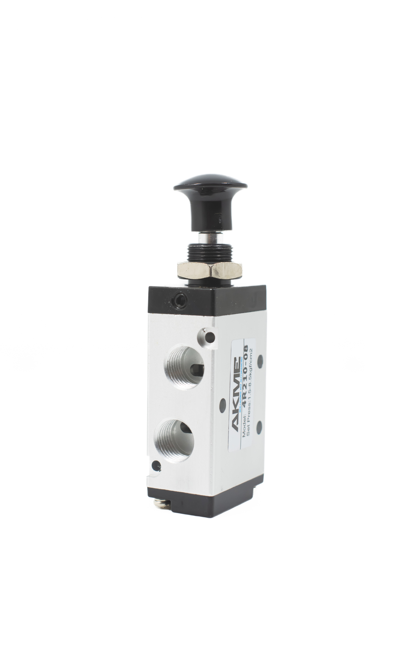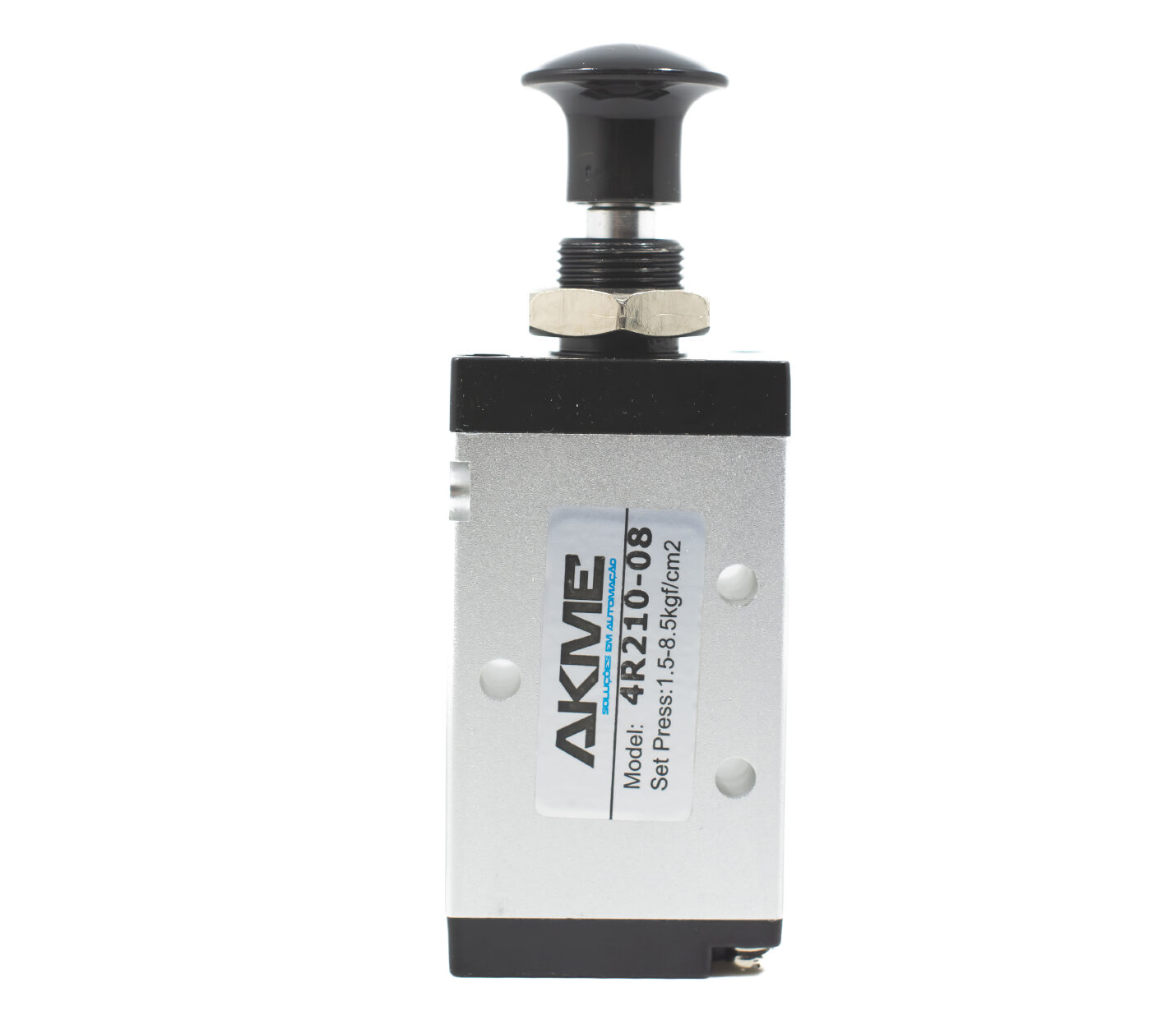 Válvula 5/2 vias com botão de operação e travamento, modelo 4R210-08, com conexão de 1/4" BSPP. Esta válvula é ideal para controlar o fluxo de ar em sistemas pneumáticos, permitindo alternância entre dois estados de forma manual, com o botão de operação e mecanismo de travamento para maior segurança e controle.Produto