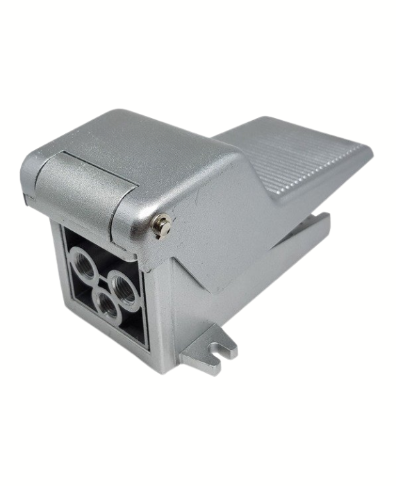 Válvula pneumática acionada por pedal com retorno por mola, utilizada para controlar o fluxo de ar comprimido em sistemas pneumáticos. Possui configuração de 4 vias e 2 posições, permitindo direcionar o ar para diferentes linhas do circuito ao pressionar o pedal, retornando automaticamente à posição inicial quando o pedal é liberado. É aplicada no acionamento de cilindros pneumáticos e comandos manuais em máquinas e equipamentos industriais.
