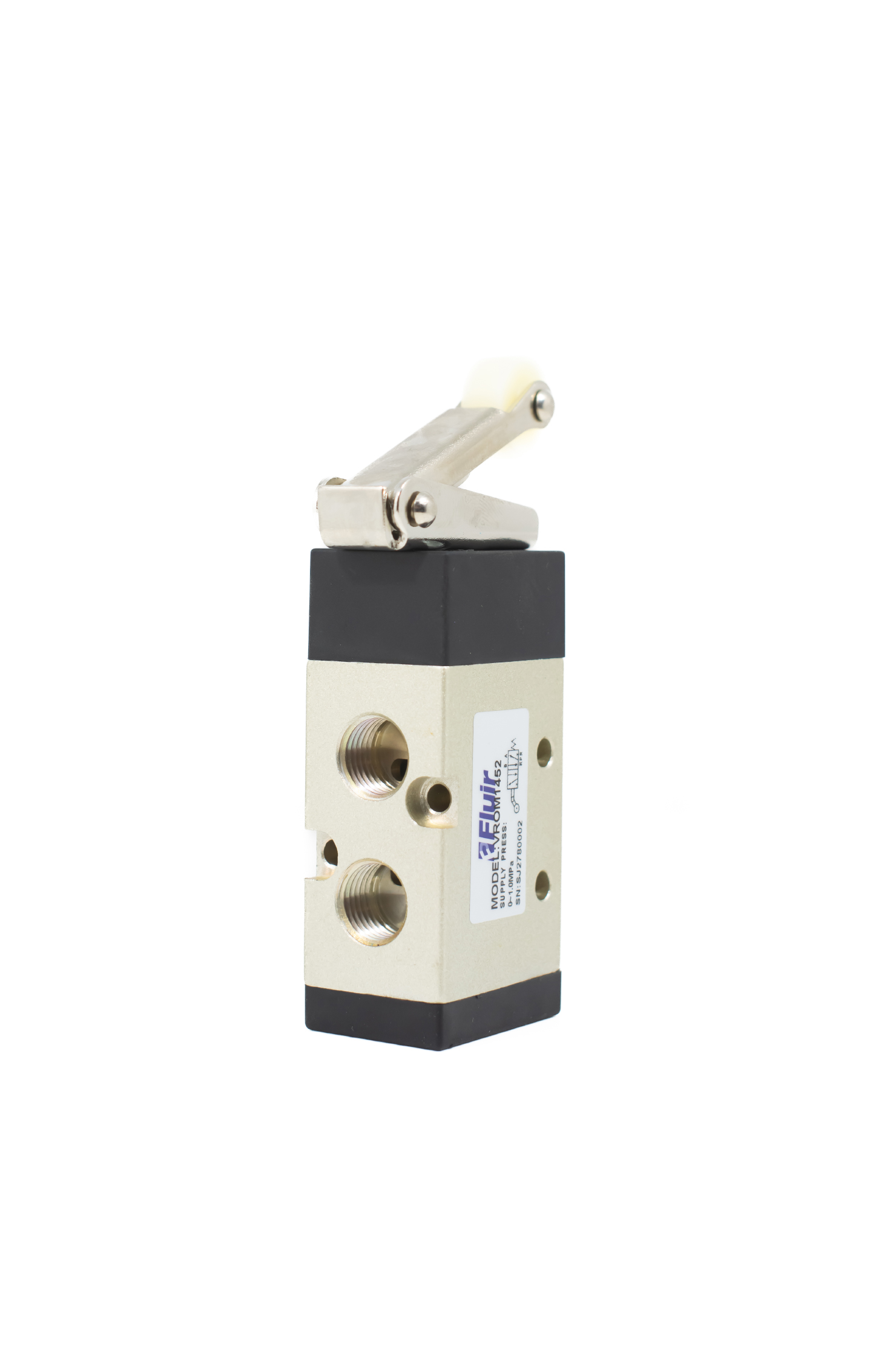 Válvula rolete/mola, modelo VROM1452 Fluir, com conexão de 1/4" e configuração de 5/2 vias. Uma válvula que opera com um mecanismo de rolete e mola, oferecendo um controle preciso e confiável de fluxo de ar em sistemas pneumáticos, ideal para aplicações que bloqueiam alternância entre dois estados.