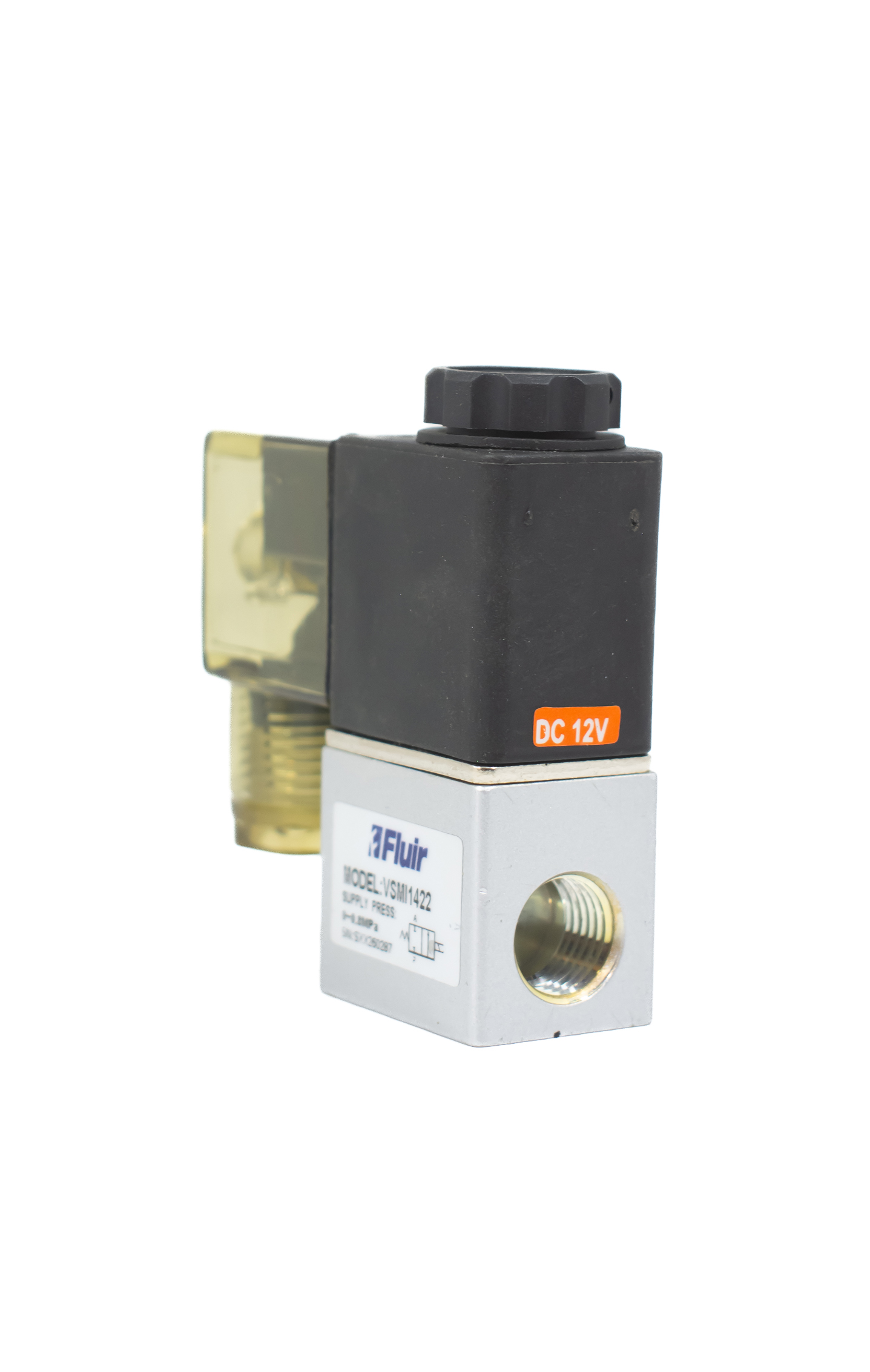 Válvula solenoide mini 2/2 vias com conexão 1/4" e bobina 12 Vcc, modelo VSMI1422E5, indicada para controle de ar comprimido em aplicações compactas que exigem resposta rápida, baixo consumo e operação confiável.Produto